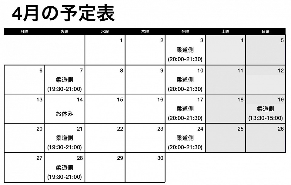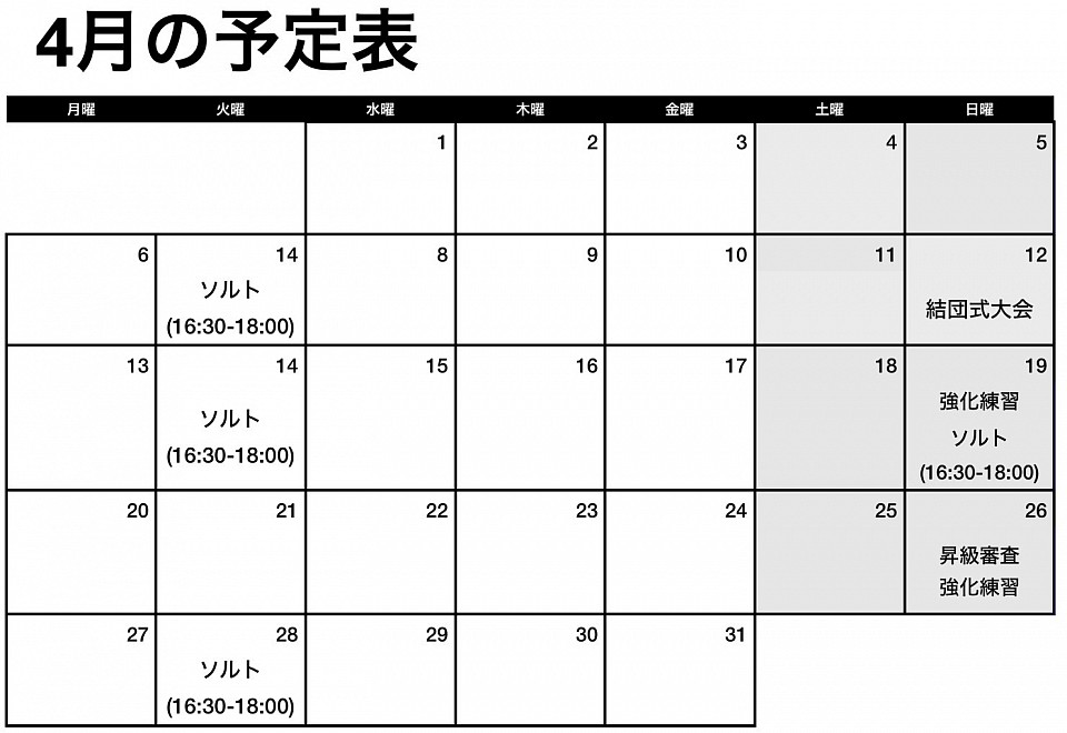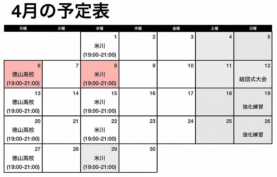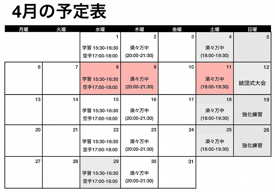 ○色付きの日が見学可能日です。